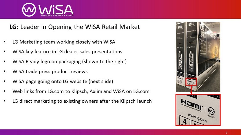 8 TV recognizes USB WiSA “Ready” Transmitter WiSA loudspeakers found and assigned or reassigned WiSA Logo every time consumer changes volume Wireless loudspeakers connected in 2 - 3 seconds Easy Set Up Process Through TV User Interface 2 3 1 2 3 1