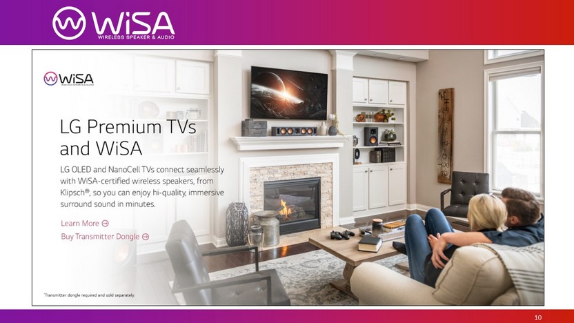 LG: Leader in Opening the WiSA Retail Market • LG Marketing team working closely with WiSA • WiSA key feature in LG dealer sales presentations • WiSA Ready logo on packaging (shown to the right) • WiSA trade press product reviews • WiSA page going onto LG website (next slide) • Web links from LG.com to Klipsch, Axiim and WiSA on LG.com • LG direct marketing to existing owners after the Klipsch launch 9