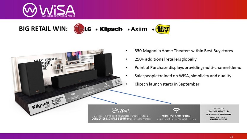 BIG RETAIL WIN : + + + • 350 Magnolia Home Theaters within Best Buy stores • 250+ additional retailers globally • Point of Purchase displays providing multi - channel demo • Salespeople trained on WiSA , simplicity and quality • Klipsch launch starts in September 11