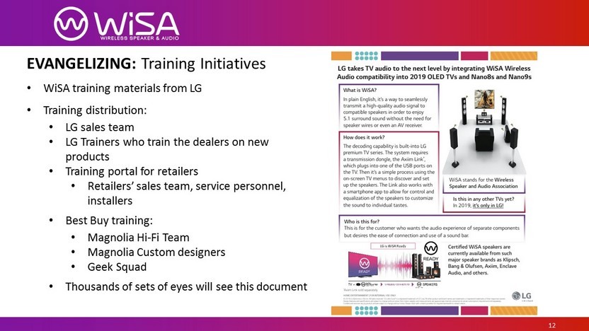 EVANGELIZING: Training Initiatives • WiSA training materials from LG • Training distribution: • LG sales team • LG Trainers who train the dealers on new products • Training portal for retailers • Retailers’ sales team, service personnel, installers • Best Buy training: • Magnolia Hi - Fi Team • Magnolia Custom designers • Geek Squad • Thousands of sets of eyes will see this document 12
