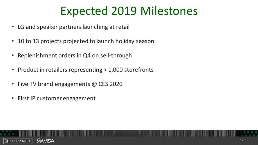 WiSA Ready TV Market Opportunity Estimated SAM for LG TVs 16 Total Serviceable Market (SAM) Total Unit Volume 10M 20M 30M 25% External Audio Systems Attached* 2.5M 5.0M 7.5M 20% WiSA Attach Rate of Audio Systems* 0.5M 1.0M 1.5M AVG Configuration 3.1* 5 5 5 Total Number of Modules 2.5M 5.0M 7.5M Price per Module* $9.00 $9.00 $9.00 Potential Revenue $22.5M $45.0M $67.0M *Key Assumptions WiSA’s mission is to build retail and consumer awareness and deliver lower price solutions to optimize the market opportunity ( ) ( ) ( )